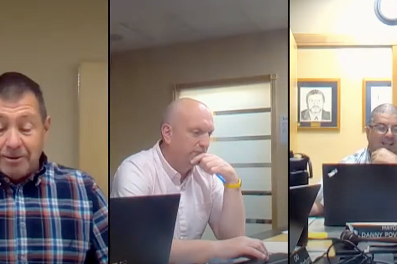 Town of Hanna Director of Public Works Brent Olesen (far left) reports on the problematic South Municipal Road during the June 10 council meeting. Middle is CAO Matthew Norburn and far right is